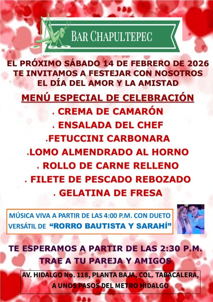 Disfruta de la semana del Amor y Amistad, en tu Bar Chapultepec.